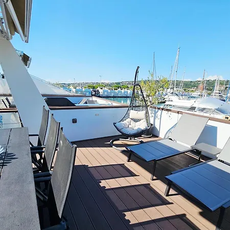 The beachfront 1-bedroom Floating Sea House - Vital Lux is situated in a beach area of Portoroz, offering a Jacuzzi, around a 10-minute ride from Church of St. Francis of Assisi. The apartment is fitted with a terrace which boasts views of the pool.